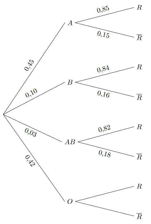 Ici, les événements A, B, AB et O forment une partition de l’univers. On peut donc appliquer la formule des probabilités totales pour calculer \(P(R)\) : \[ P(R) = P(A \cap R) + P(B \cap R) + P(AB \cap R) + P(O \cap R) \] \[ P(R) = P(A)P_A(R) + P(B)P_B(R) + P(AB)P_{AB}(R) + P(O)P_O(R) \]