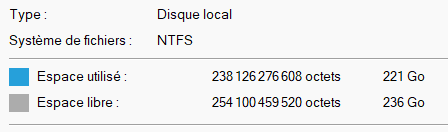 Sur la capture d’écran ci-dessous, réalisée sous Windows 11, nous constatons que la valeur est affichée en Go, donc a priori en système décimal. Mais en réalité, la valeur affichée en octets correspond à 221 Gio. Le système ne respecte donc pas les conventions internationales.