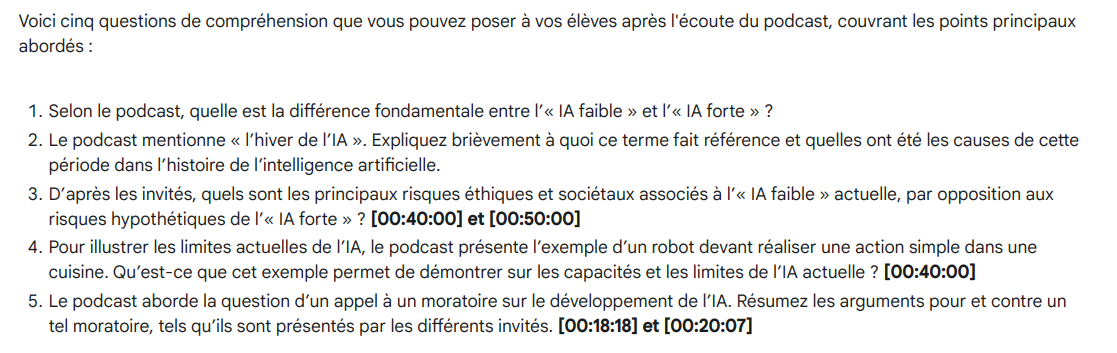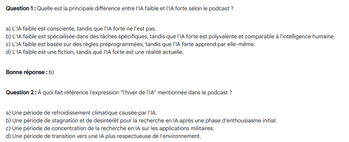 - QCM : Créer un QCM à partir du résumé du podcast. Les élèves devront choisir la bonne réponse parmi plusieurs propositions.