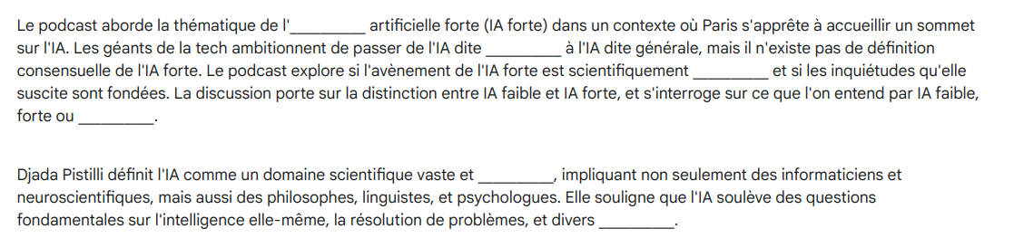 Je suis professeur et je veux créer un texte à trous à partir du résumé du podcast. Peux-tu me proposer un texte à trous avec 10 mots manquants ? Indique la solution en dessous du texte.