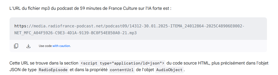 - L’IA va alors extraire l’URL du fichier MP3 du podcast. Vous pouvez ensuite copier-coller cette URL dans votre navigateur internet pour ouvrir et télécharger le fichier (clic droit).